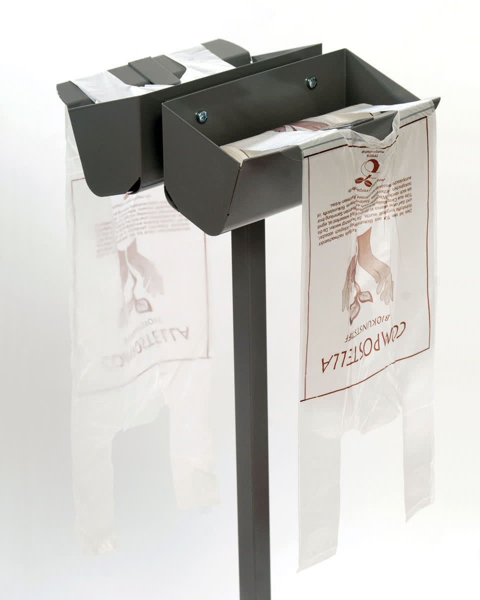 Die Beutelabroller für Maisstärkebeutel werden aus Stahlblech gefertigt und sind grau lackiert. Sämtliche Produkte Made in Germany.