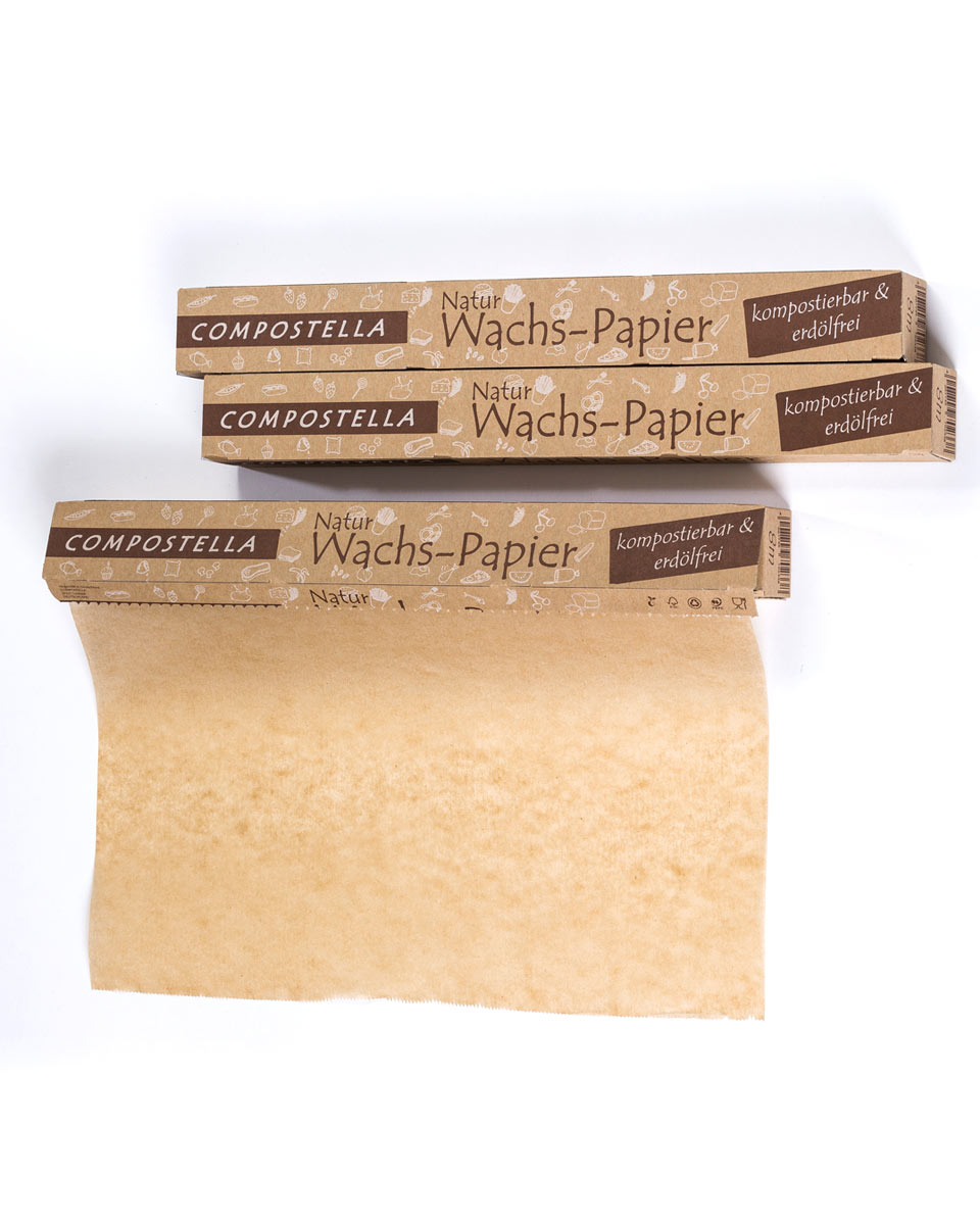 Herkömmliche Wachspapiere, wie sie in Metzgereien, Fischgeschäften oder Käsetheken als Einschlagpapiere verwendet werden, haben üblicherweise eine Wachsbeschichtung aus Paraffin. Paraffin ist jedoch ein Erdölprodukt, und Erdölprodukte widersprechen unserem Nachhaltigkeitsgedanken. Beim COMPOSTELLA Naturwachs-Papier besteht sowohl das Papier als auch die Beschichtung aus pflanzlichen, und damit nachwachsenden Rohstoffen. Carnaubawachs ist ein reines Pflanzenwachs, das aus den Blättern der Carnabapalme gewonnen wird, und sich immer wieder nachbildet. Das reine Pflanzenwachs wird in der Lebensmittel und Kosmetikindustrie verwendet und ist gesundheitlich völlig unbedenklich.