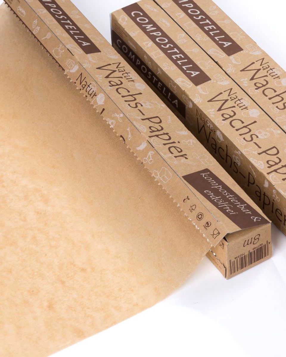 COMPOSTELLA naturreines Wachspapier ist eine Weiterentwicklung des COMPOSTELLA Delikatessenpapiers. Während das Delikatessenpapier ohne Beschichtung auskommt und „nur“ fettdicht ist, besitzt Naturwachspapier eine hauchdünne Carnaubawachs-Beschichtung, damit auch feuchte Speisen wie z. B. geräucherter Fisch, gekochter Schinken, Ziegenkäse etc. in völlig natürlichem Material verpackt und gut aufbewahrt werden können.
