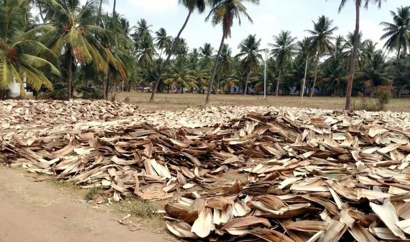 Nach dem Aufsammeln werden die Blätter der Areca-Palme unter freiem Himmel in der Sonne getrocknet bevor sie weiterverarbeitet werden.